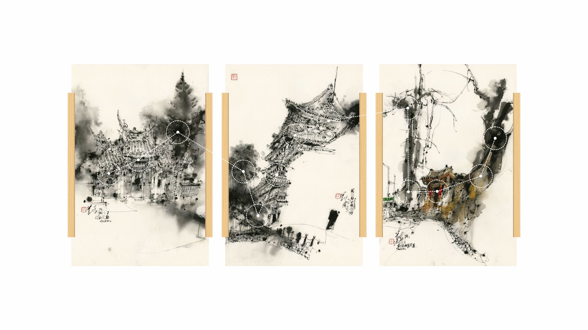 這次特別想和大家分享我在佈展時的一些小細節。請看圖示中以虛線串起的圓圈點,就可明白我在工作坊不斷強調的「節奏感」。作品之間的留白、對齊與跳躍,決定了觀者穿梭在這些畫作間的呼吸頻率。